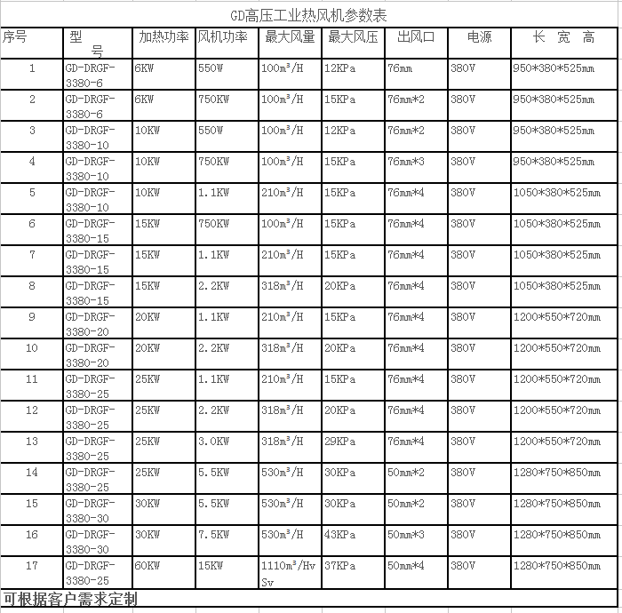 高压型热风机选型表